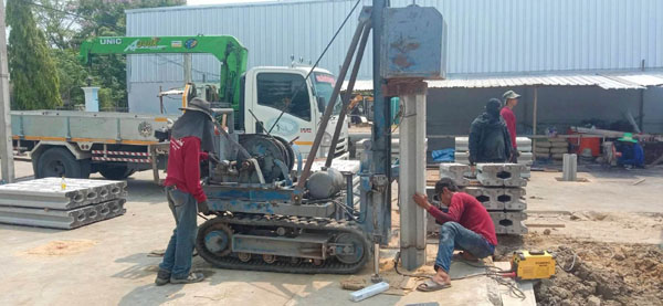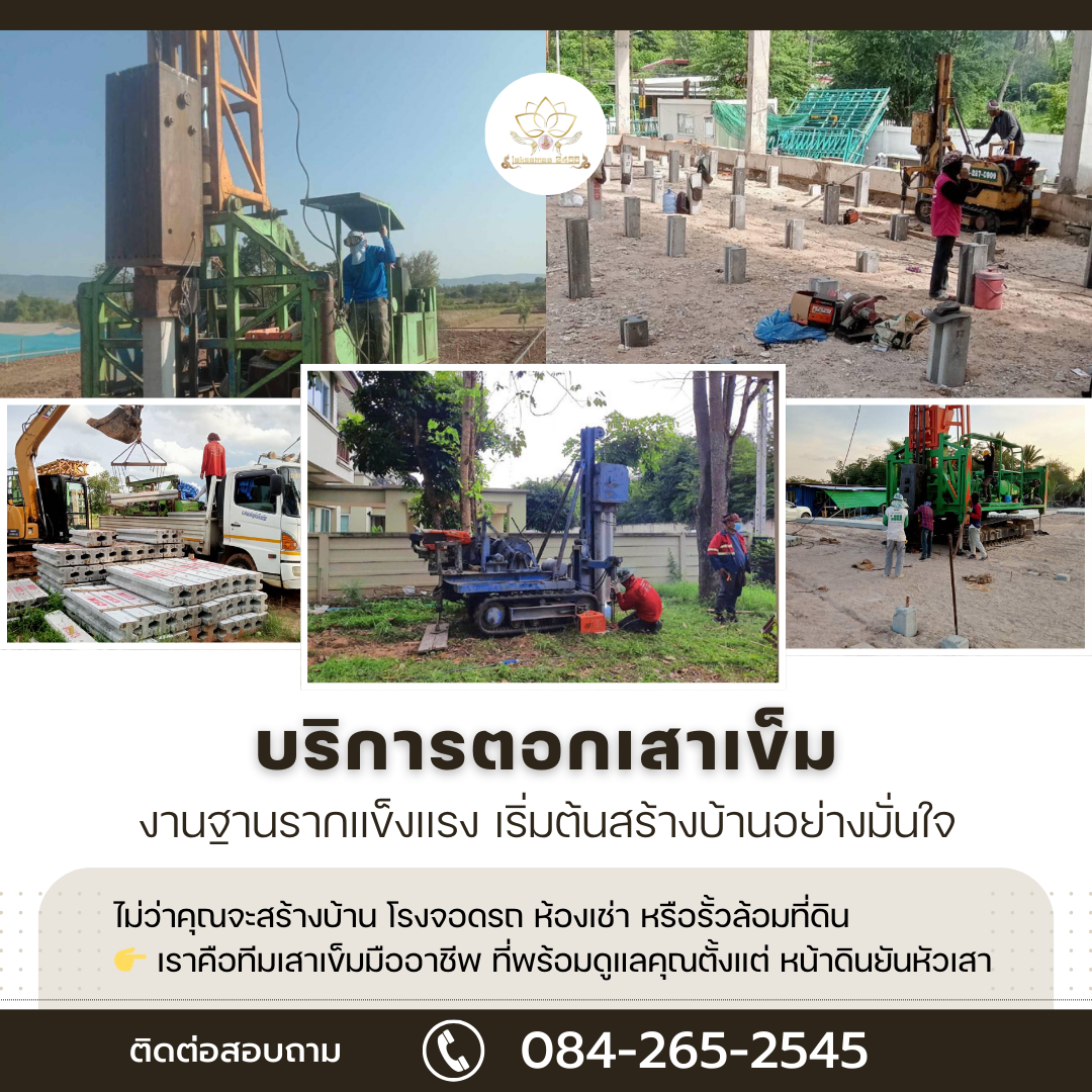 - ตอกเสาเข็ม — เข็มคอนกรีตอัดแรง/ไมโครไพล์ • ทดสอบ PDA/Static/Integrity ตาม มยผ. • แผนยก-ตั้งเครื่องตอกปลอดภัย
